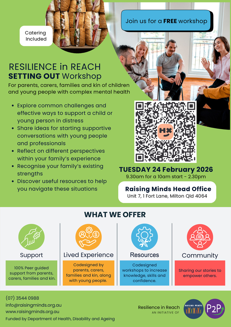 Resilience in Reach is a 100% peer-led initiative providing tools, resources, workshops, and community support for families, parents, carers, and kin of children and young people with complex mental health conditions and/or complex psychosocial disabilities
